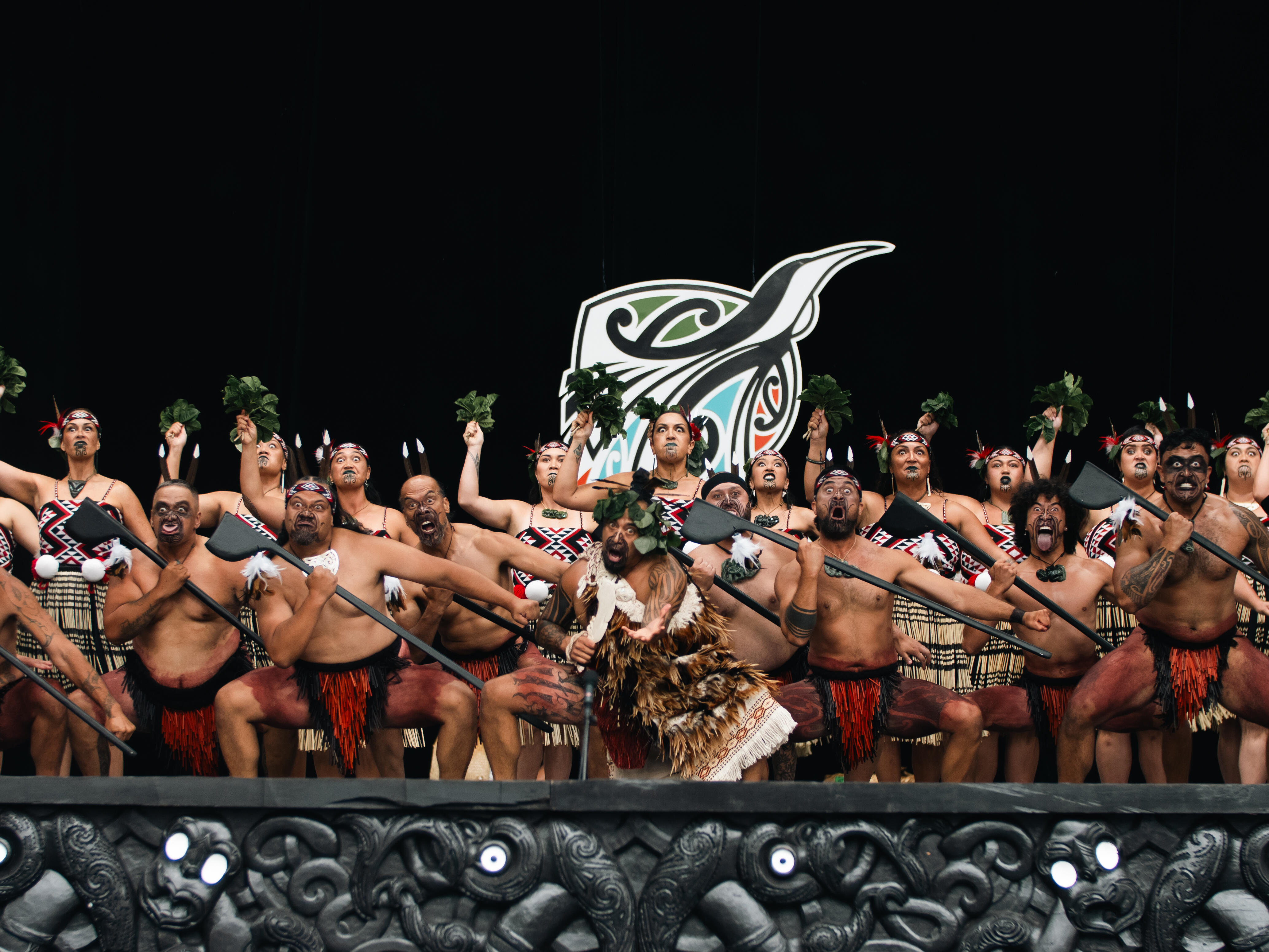 Their striking attire carries profound symbolism: black for Te Pō (the night), white for Te Ao Mārama (the world of light), and red for Papatūānuku (the Earth Mother).